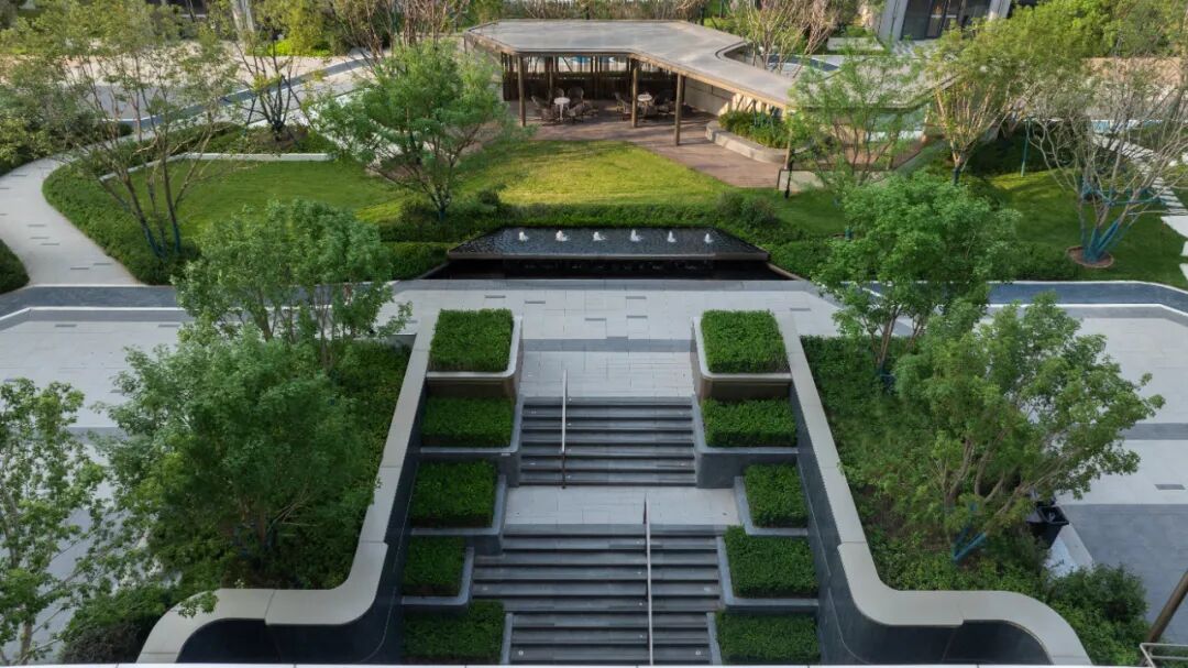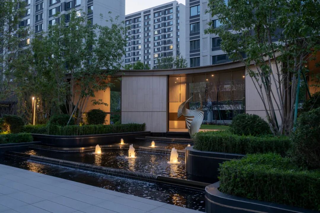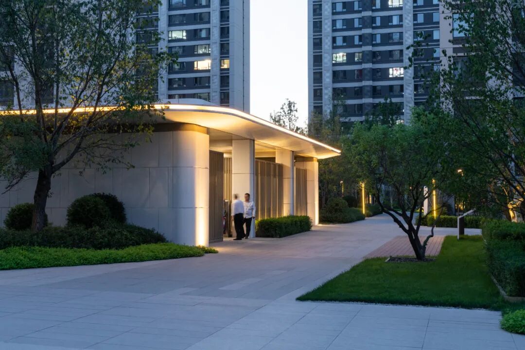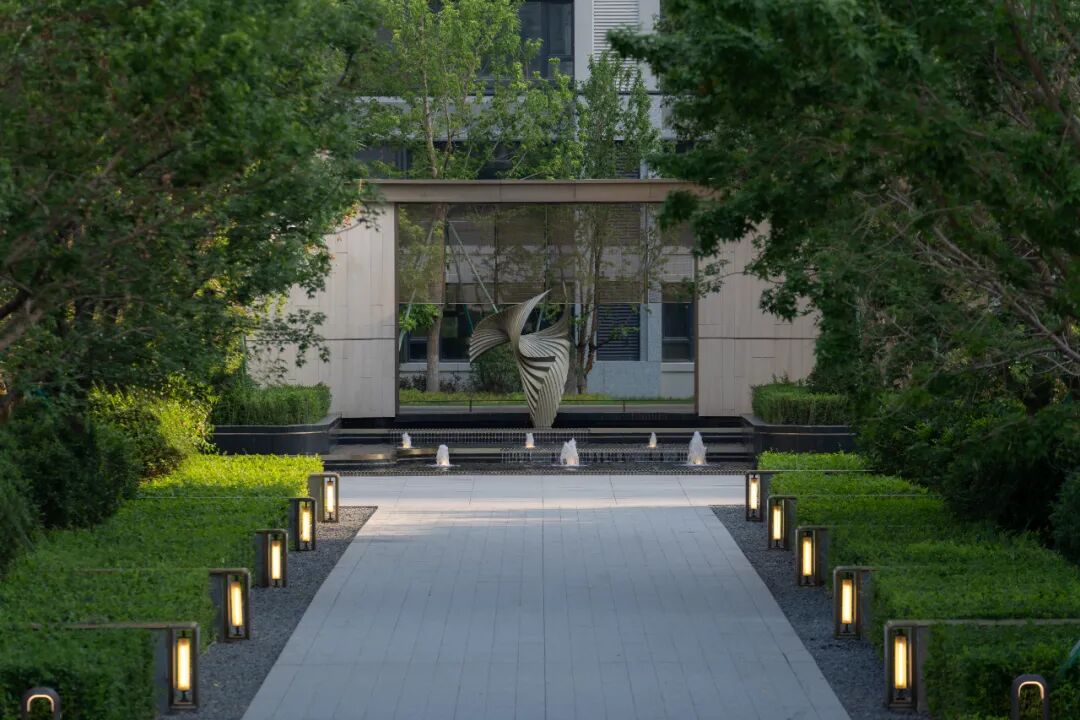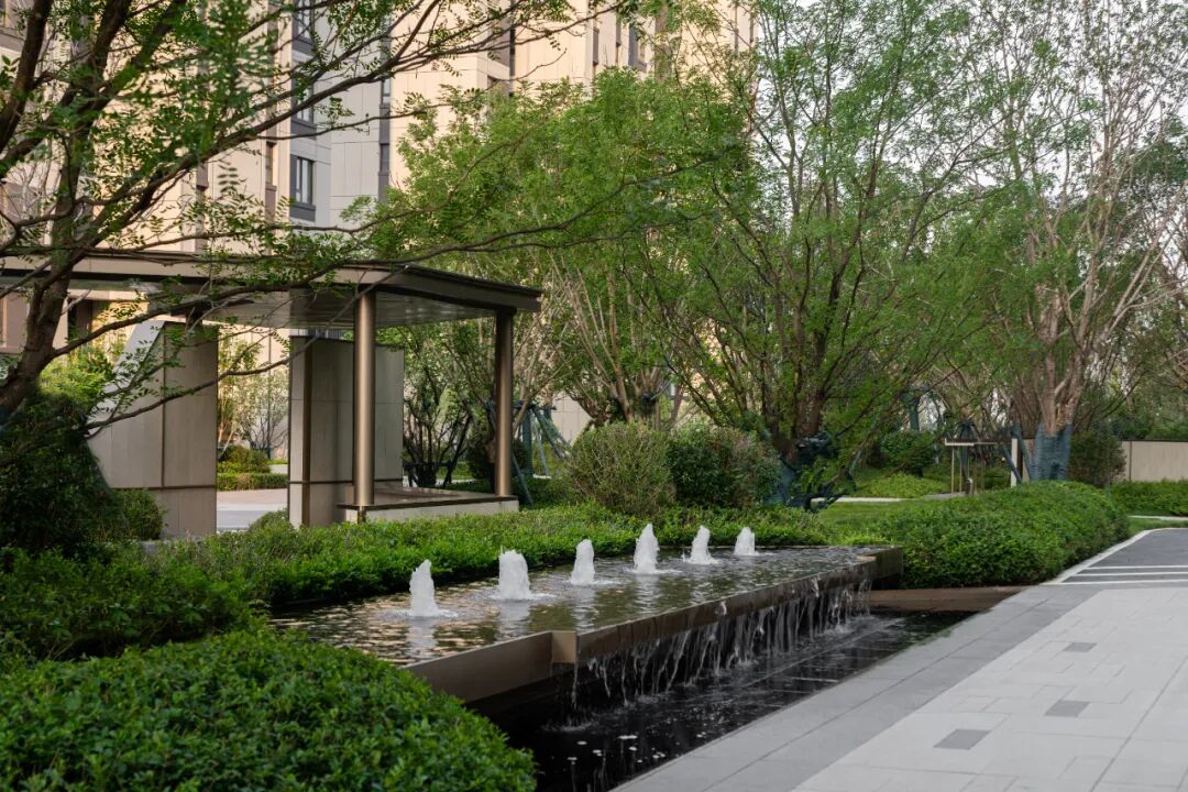 酒店式迎宾入口处,地毯式铺装与序列植栽层层递进,跌水景观与弧形廊架相映成趣,营造出尊崇而温馨的仪式感。
