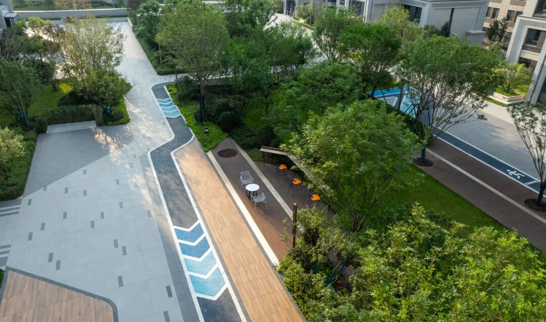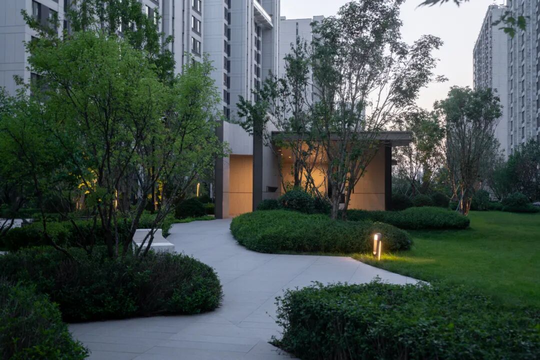 细节之处更见匠心:透水铺装与下凹绿地践行海绵城市理念,让雨水自然渗透;庭院灯与草坪灯高低错落,无炫光设计兼顾安全与美感。
