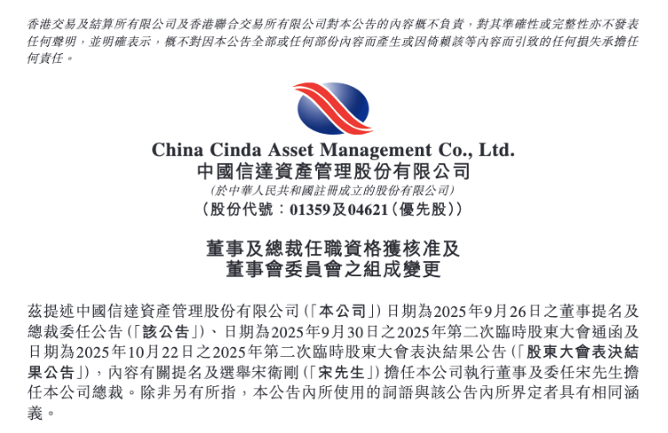 中国信达1月5日发布公告称,公司于近日收到金融监管总局核准宋卫刚担任公司董事及总裁资格的批复。据此,宋卫刚担任中国信达执行董事,其董事委任于2025年12月31日起生效,任期三年,任期届满可以连选连任。同时,宋卫刚担任公司总裁,其总裁委任于2025年12月31日起生效。宋卫刚还担任董事会战略发展委员会委员。