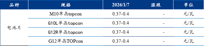 光伏电池片价格继续强势上行,头部企业自上周起普遍将N型各尺寸报价推高至0.4元/瓦,释放坚定挺价信号。在银浆价格持续高位及硅片成本支撑下,电池环节成本压力显著,推动厂商积极寻求价格突破。实际成交方面,市场主流成交价已从前期0.36元/瓦稳步上移至0.37–0.38元/瓦区间,部分头部企业已有0.395元/瓦的少量高价成交。