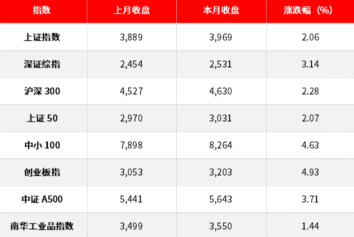 12月市场震荡上涨。全月来看,主要股指均上涨,上证综指、深证综指、沪深300、创业板指涨跌幅分别为2.06%、3.14%、2.28%、4.93%,南华工业品指数上涨1.44%。12月当月涨跌幅前五的行业(申万一级行业,下同)为国防军工、有色金属、通信、机械设备、石油石化,涨跌幅分别为17.22%、13.68%、12.06%、8.59%、7.01%;涨跌幅后五位的行业为食品饮料、医药生物、房地产、煤炭、公用事业,涨跌幅分别为-5.22%、-4.10%、-3.96%、-3.56%、-2.46%。