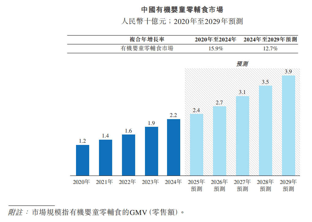 公开数据显示,有机婴童零辅食市场规模,已由2020年的12亿元增至2024年的22亿元,复合年增长率高达15.9%。预计2029年,将增至39亿元。