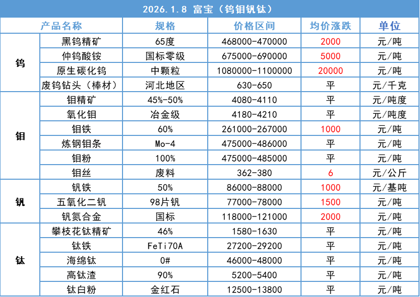 2026.1. 8 富宝铁合金小金属报价行情一览丨需求持续疲软,硅系延续弱势