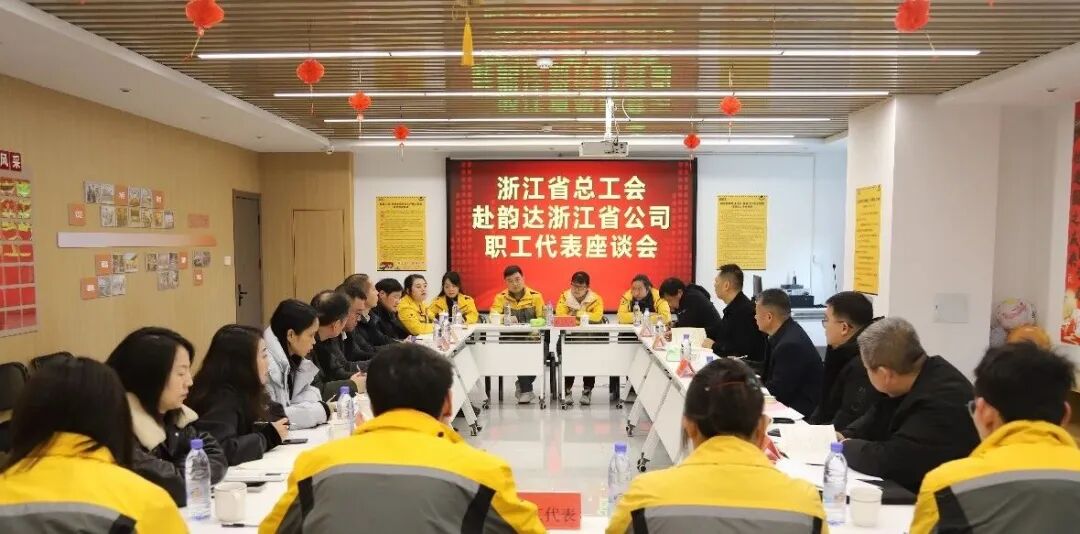 座谈会上,韵达浙江省公司负责人对调研组一行的到来表示欢迎,对省市县三级总工会长期以来对公司的大力关心与支持表示感谢,并简要介绍了企业创立背景、成长历程、荣誉成就等。紧接着,浙江省公司工会主席、副主席分别汇报了企业工会工作、员工关爱及企业用工情况。