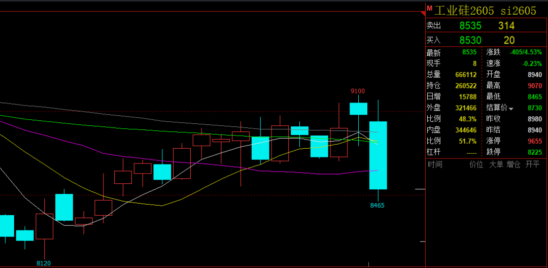 今日工业硅期货行情飘绿运行,盘面价格相较昨日明显松动。1月8日,截止15:00收盘,工业硅主力合约2605收盘松动下行,开盘8940,收盘下调405至8535,跌幅4.53%,收盘价格相较上一交易日下调445。另,主力合约当日成交总量为666115手,持仓量260531手,具体如下图所示: