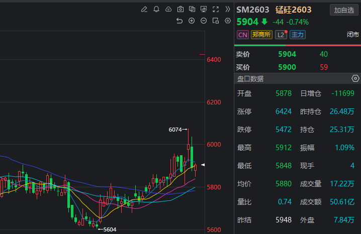 今日SM2603合约呈现探底回升的窄幅波动格局。早盘开于5878点,盘中短暂下探至全日最低5848点后获得支撑,随后震荡回升,午后最高触及5912点,尾盘小幅回落,最终收于5904点,较前一交易日上涨12点。日线收出一根带较长下影线的小阳线,显示下方存在一定买盘支撑。全天成交量环比明显萎缩10.4万手至17.2万手,持仓量减少1.2万手至25.3万手,仓单数量减少2000张至27197张。整体来看,市场在连续回调后进入缩量整理阶段,多空双方趋于谨慎。MACD指标双线仍位于零轴上方,但差值继续收窄,柱状线进一步缩短。显示上涨动能持续减弱,多头趋势有所放缓,处于高位钝化后的收敛状态。KDJ指标三线同步下行并脱离超买区,暗示短期下跌速度可能减缓,存在技术性反抽需求。今日收盘价位于中轨与上轨之间,更靠近中轨。通道整体保持向上倾斜,但价格已脱离上轨压制,向中轨靠拢寻求支撑,属于上涨趋势中的正常回调。短期均线有走平粘合迹象,但中长期均线系统依然保持多头排列并发散向上,表明中期上涨趋势的基础尚未破坏。综合来看,硅锰期货中长期上行趋势结构尚未被破坏,主要受到下方多重均线簇的支撑。但短期自高位回落,进入技术性调整与整固阶段。市场表现为上涨动能衰减后的高位震荡。建议短线以震荡思路对待,高抛低吸。中线交易者可关注价格在关键支撑位的企稳情况。(仅代表我方观点,不做投资建议,市场有风险,投资需谨慎)
