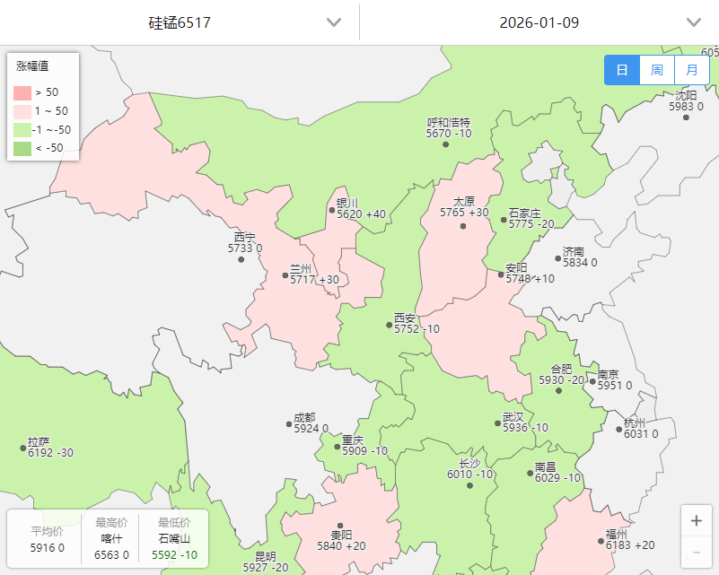 :今日合金宝指数显示:硅锰6517#(含税包到价):河北地区5775元;河南地区5748元;山东地区5834元;辽宁地区5983元;江苏地区5951元;四川地区5924元;湖南地区6010元;具体如下图所示:
