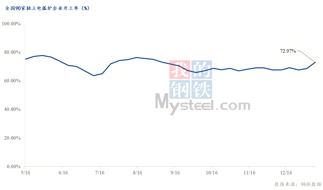 全国95家独立电弧炉钢厂平均开工率72.97%,环比上升4.34个百分点,同比上升6.95个百分点。其中华北、华东、华南、华中、西南区域小幅上升,东北区域微幅下降,西北区域持平。