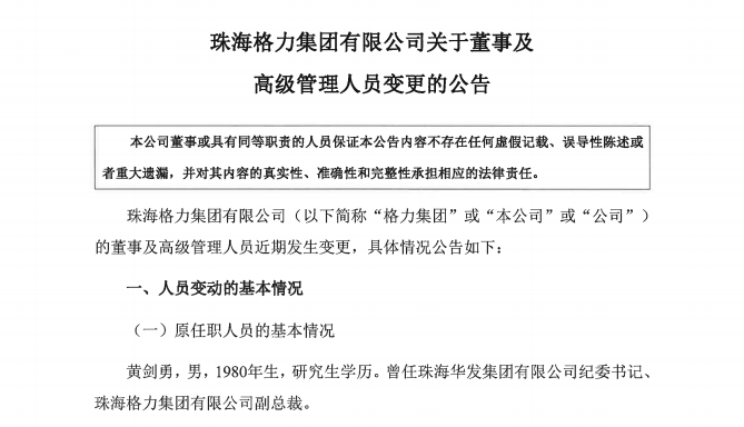 格力集团副总裁黄剑勇被解聘,原财务总监马小川接任