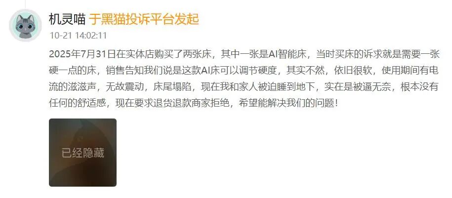 但有不少消费者在实测后反映,这款产品并没有宣传的那般“神乎其神”,疑似慕思股份通过溢价收割“智商税”。黑猫投诉平台上,也不乏用户关于“AI功能失灵”“无故震动”的投诉,且有用户遇到了要求退货退款却遭商家拒绝的情况。