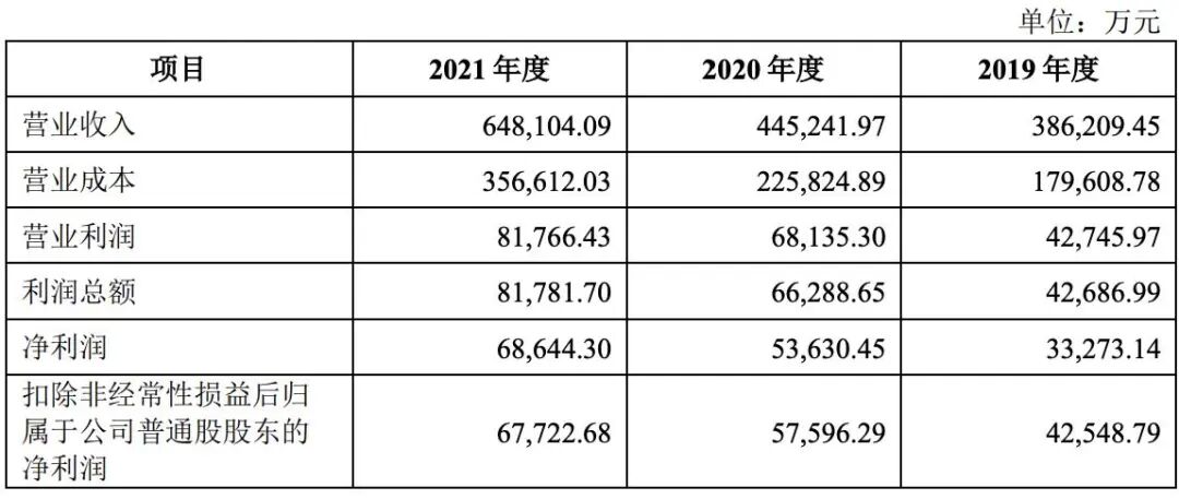 结合其过往招股书可知,该公司2018年至2021年期间所取得的成绩十分喜人,不仅收入由2018年的31.88亿元翻倍增长至2021年的64.81亿元;净利润也由2.16亿元提升至6.86亿元,为其冲刺IPO奠定了良好业绩基础。