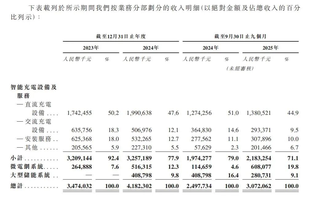 更关键的一点在于收入构成与毛利率的同步变化。其招股书显示,按业务分部划分,智能充电设备及服务收入如前所述,占比在2023年、2024年、截至2024年9月30日止9个月、截至2025年9月30日止9个月分别为92.4%、77.9%、79.0%、71.1%;微电网系统收入占比分别为7.6%、12.3%、4.6%、19.8%;大型储能系统收入占比在2024年、截至2024年9月30日止9个月、截至2025年9月30日止9个月分别为9.8%、16.4%、9.1%。