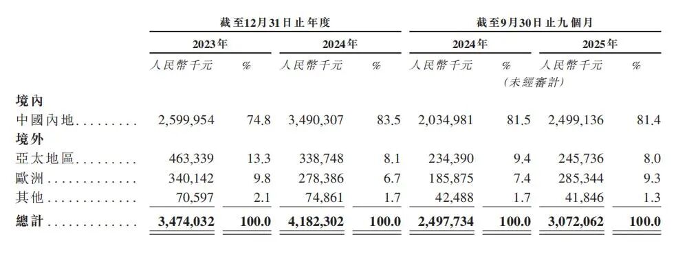 据其招股书,海外收入方面,按地区收入占比显示,2023年中国市场为74.8%,亚太为13.3%,欧洲为9.8%,其他地区为2.1%;2024年中国市场为83.5%,亚太为8.1%,欧洲为6.7%,其他地区为1.7%;截至2025年9月30日止9个月,中国市场为81.4%,亚太为8.0%,欧洲为9.3%,其他地区为1.3%。海外占比并不低,且地区分布在不同期间发生变化。