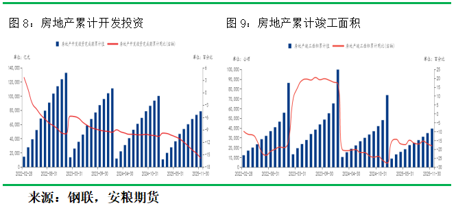 房地产各项数据依然负增长,传统消费领域季节性走弱。2025年1-11月房地产开发投资累计78590.9亿元,累计同比-15.9%,降幅较上月扩大0.4%。1-11月累计竣工面积39453.93万平方米,累计同比-18%。1-11月房地产累计施工面积656066.2万平方米,累计同比-9.6%。商品房累计销售面积78701.74万平方米,累计同比-7.8%。