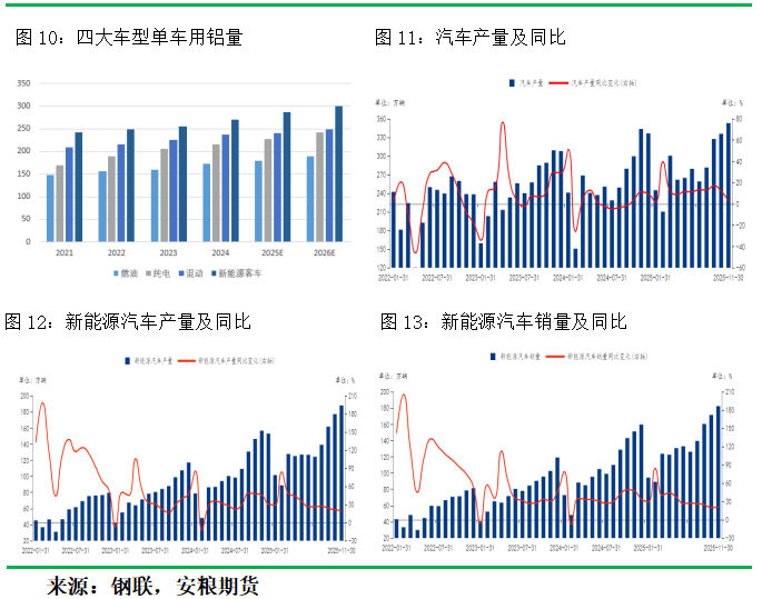 2.沪铝供应刚性稳固,需求新旧动能加速转换。从供应端看,国内电解铝供应刚性特征愈发凸显,4500万吨产能天花板政策严格限制产能扩张,供给弹性严重不足。需求端结构性分化是核心特征。传统建筑用铝需求因房地产行业持续低迷萎缩,而新兴领域则表现强劲,特别是交通运输领域在产销规模扩张和轻量化带来的单车用铝量提升双重驱动下,预计将成为新的需求支柱。这种传统趋弱、新兴强劲的格局使得总需求虽保持增长,但增速呈现趋势性放缓。