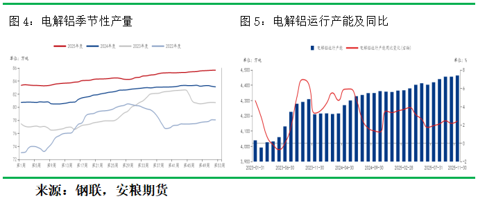 供给端来看,2017年四部委联合发布的《清理整顿电解铝行业违法违规项目专项行动工作方案》,明确电解铝4500万吨的产能“天花板”,闲置产能只能通过技改置换或淘汰来退出。今年新印发的《实施方案》提出到2027年电解铝能效基准水平以下产能完成技术改造或淘汰退出,政策倒逼闲置产能加速出清。新增供给方面,当前废铝、再生铝市场发展不完全,铝制品报废周期尚未来临,预期接下来三年废铝产量增速面临边际衰减,再生铝替代原铝的量级和应用领域均受限,因此原铝供给刚性尚存。数据显示,截至2024年底,我国电解铝产量录得4463.93万吨,同比3.88%。截至2025年11月底,我国电解铝运行产能已达4455.93万吨,同比增长2.43%。