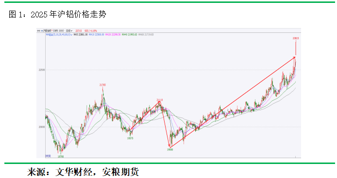 1.2025年宏观与基本面交织,沪铝稳健上行创出新高。年内沪铝期货价格整体呈现稳健的震荡上行态势,全年核心运行区间为19000-23000元/吨。1-4月铝价稳步走强后,受美国对等关税政策冲击,价格深度回调,后随着美联储降息周期开启、电解铝库存低位给予支撑等利好因素共振,沪铝期货自11月成功突破22000元/吨,不断创年内新高,展现出较强的韧性。