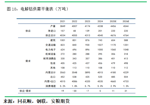 2025年,电解铝需求端现显著的结构性分化特征。上述传统消费领域如建筑型材受房地产行业低迷拖累表现疲软,但交通运输特别是新能源相关领域如光伏、新能源汽车以及电网投资则保持快速增长,成为铝需求的主要增长点。