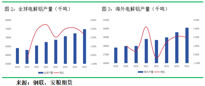 全球铝供应格局在2025年呈现明显的内外分化特征。从全球视角看,2024年全球原铝产量达到6900万吨,其中中国产量4150万吨,海外产量2750万吨,这一产量分布格局在2025年将发生重要变化。据钢联数据测算,全球供应增速预计从2024年的3.1%放缓至2.38%,2025年全球电解铝产量7482.7万吨,其中,海外电解铝产量3026.4万吨,同比增长1.88%,产量同期增加56万吨,中国电解铝产量4456.3万吨,同比增长2.73%。供应增长放缓的主要制约因素来自中国严格的产能天花板政策,4500万吨的产能红线使得2025年可投放的新增项目极少。与此同时,海外市场也面临多重挑战,欧洲地区由于能源成本持续高企,部分产能仍处于关停状态,而中东地区的新建项目则受制于投资决策谨慎,投产进度可能低于预期。