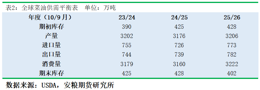 一、全球市场:预期全球菜油库存消费比稍有收紧