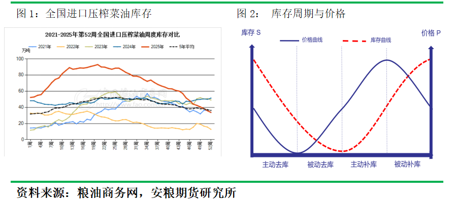 总体来看,25/26年度,国内菜油供需相较于上一年变化幅度较小,不排除阶段性的供需错配因素。叠加期初库存、供给与需求的因素,新年度库存消费比预期为21.7%,低于上一年度的24.5%。2026年,菜油在经过2025年被动增库与主动去库的洗礼后,新年度或进入主动去库的尾声阶段以及被动去库环节。