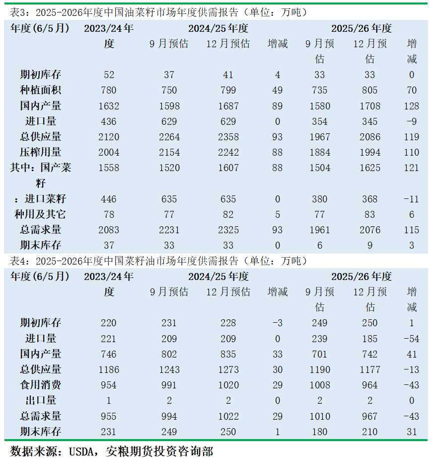 菜油的需求受到宏观经济环境、豆油、棕榈油与葵油等替代油脂价格的影响与本身刚性需求的支撑(以川渝小包装以及花椒油为代表的川调味品的刚需占菜油总消费的60%—70%)。当前,菜油价差相对于豆油处于小幅升水、菜棕油价差处于中低位区域,预计菜油对棕榈油的替代属性或有所边际性增加。结合新年度国内宏观经济,预计25/26年度相较于上一年度,总需求或微幅收紧。