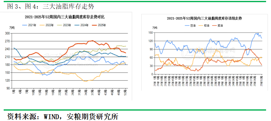 国内菜油供需面:25/26年度,国内菜油供需相较于上一年变化幅度较小,不排除阶段性的供需错配因素。叠加期初库存、供给与需求的因素,新年度库存消费比预期为21.7%,低于上一年度的24.5%。2026年,菜油在经过2025年被动增库与主动去库的洗礼后,新年度或进入主动去库的尾声阶段以及被动去库环节。