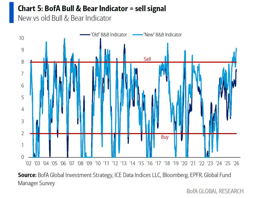 美银的牛熊指标在12月31日已达到9.0的“极度看涨”水平(触发反向卖出信号),但这被全球股市的强劲广度和对冲基金通过期货增加标普500多头头寸所抵消。