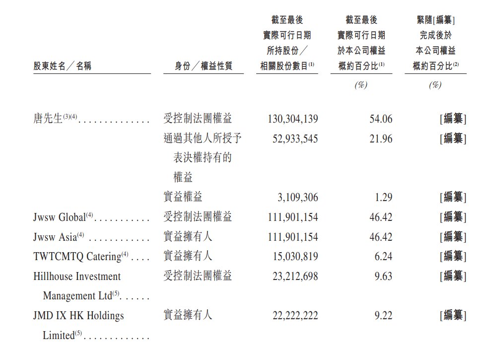 因此,唐先生与Jwsw Global、Jwsw Asia、TWTCMTQ Catering、TWTTQCM Catering、唐企智汇及员工持股计划平台I共同构成公司控股股东。