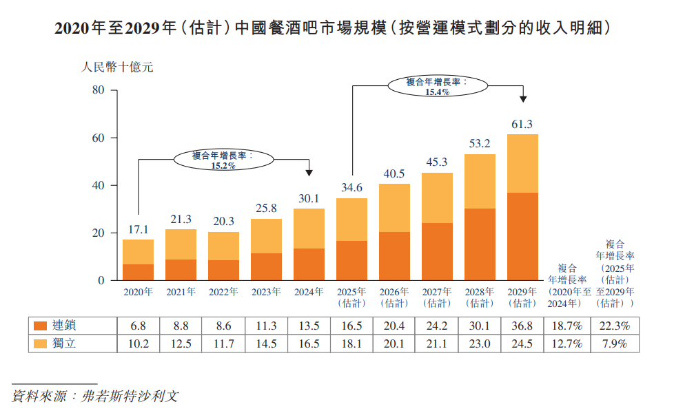 受益于标准化营运以及能够满足休闲以至商务场景的多样化客户要求,过去数年连锁餐酒吧实现强劲增长。连锁餐酒吧的市场规模由2020年的人民币68亿元增至2024年的人民币135亿元,复合年增长率为18.7%。在推动夜间经济、采取全天候营运模式以及餐饮供应链变革的进一步推动下,市场规模预计将由2025年的人民币165亿元增长至2029年的人民币368亿元,期内复合年增长率为22.3%。