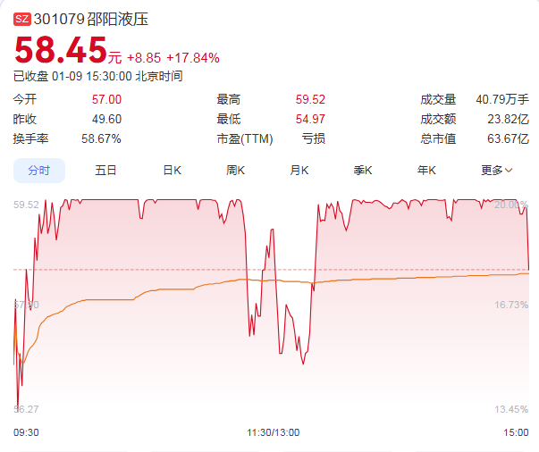 1月9日,邵阳液压强势上涨17.84%,收盘价为58.45元,成交额为23.82亿元,总市值攀升至63.67亿元。据统计,自2025年12月24日以来的短短11个交易日内,邵阳液压股价累计涨幅已超过106%,表现非常亮眼。