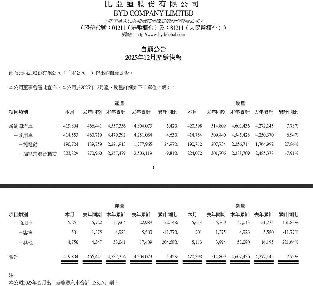 2025年,比亚迪汽车全年销460.2万辆,同比增长7.7%,以100.1%的达成率完成下调后的全年销量目标,并继续蝉联国内车企销冠、国内品牌销冠以及全球新能源车销冠,甚至如果单论纯电车型,也超过了全球霸主特斯拉。