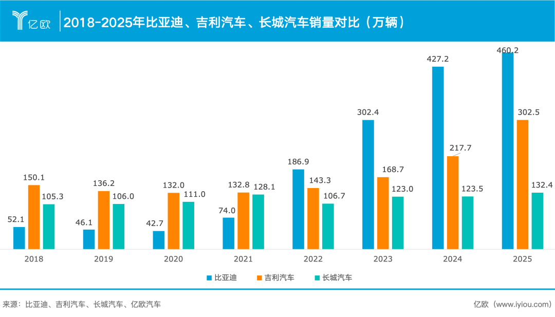 借势这股浪潮,比亚迪以186.9万辆(2022年)、302.4万辆(2023年)、427.2万辆(2024年)、460.2万辆(2025年)的年度销量一骑绝尘,不仅碾压吉利、长城等两位自主大哥,更包揽自主品牌与新能源品牌销量双冠王,上演断层式领先。