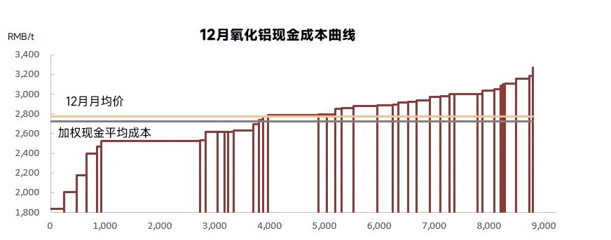 12月份,全国氧化铝加权平均完全成本环比下降1.93%。