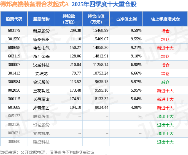 德邦高端装备混合发起式A的前十大重仓股如下: