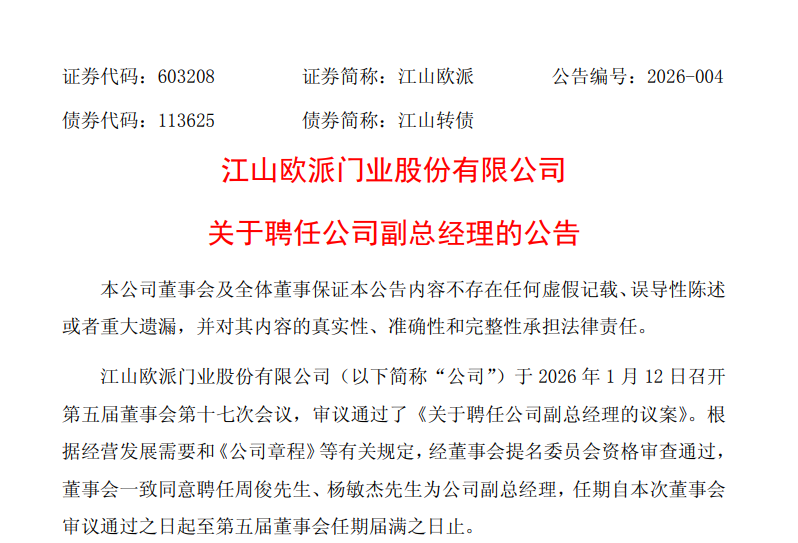 乐居财经 李兰 1月12日,江山欧派(603208.SH)发布公告,董事会一致同意聘任周俊、杨敏杰为公司副总经理。