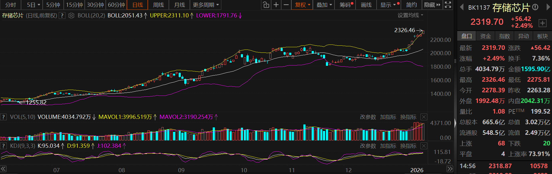 存储芯片指数今日也一同拉涨逾2%,其盘中最高冲至2326.46的历史新高,截至日间收盘,存储芯片指数以2.49%的涨幅报2319.7。