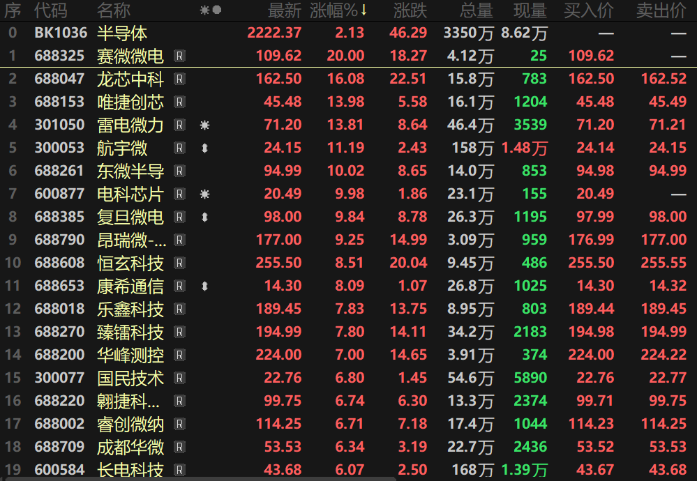 个股方面,赛微微电20CM涨停,龙芯中科、唯捷创芯、雷电微力等多股涨逾10%,电科芯片以9.98%的涨幅涨停。复旦微电、恒玄科技、康希通信等多股纷纷跟涨。