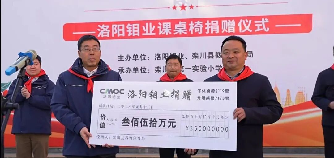1月12日,在冬日暖阳的映照下,“情暖栾川教育·爱心赋能成长”洛阳钼业课桌椅捐赠仪式在栾川县第一实验小学温情举行。作为扎根栾川、反哺家乡的企业,洛阳钼业再次以实际行动践行企业社会责任,为栾川县教育系统捐赠学生可躺式午休桌椅、可调节高度的升降式座椅9292套,价值350万元,惠及全县42所学校,有效改善学生们的学习与午休条件。