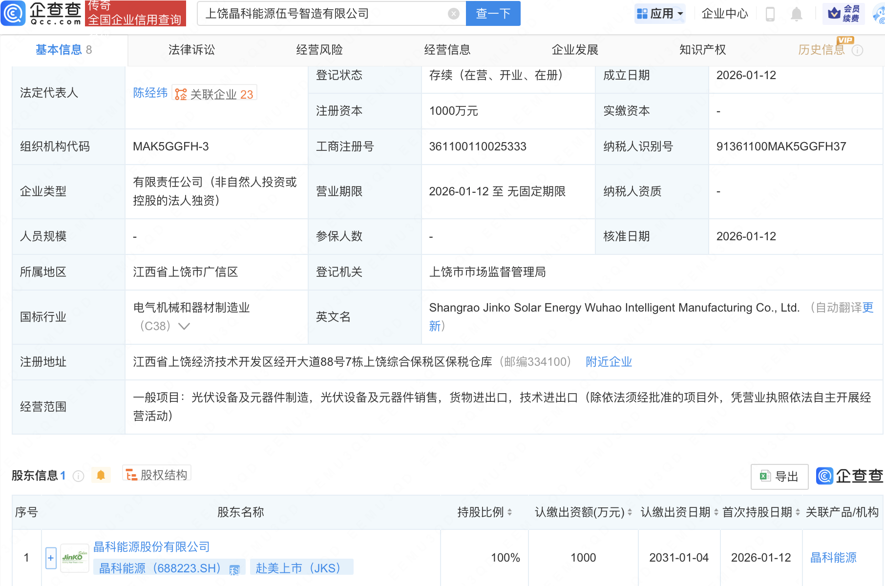 企查查APP显示,近日,上饶晶科能源伍号智造有限公司成立,经营范围包含:光伏设备及元器件制造,光伏设备及元器件销售,货物进出口,技术进出口。企查查股权穿透显示,该公司由晶科能源(688223)全资持股。
