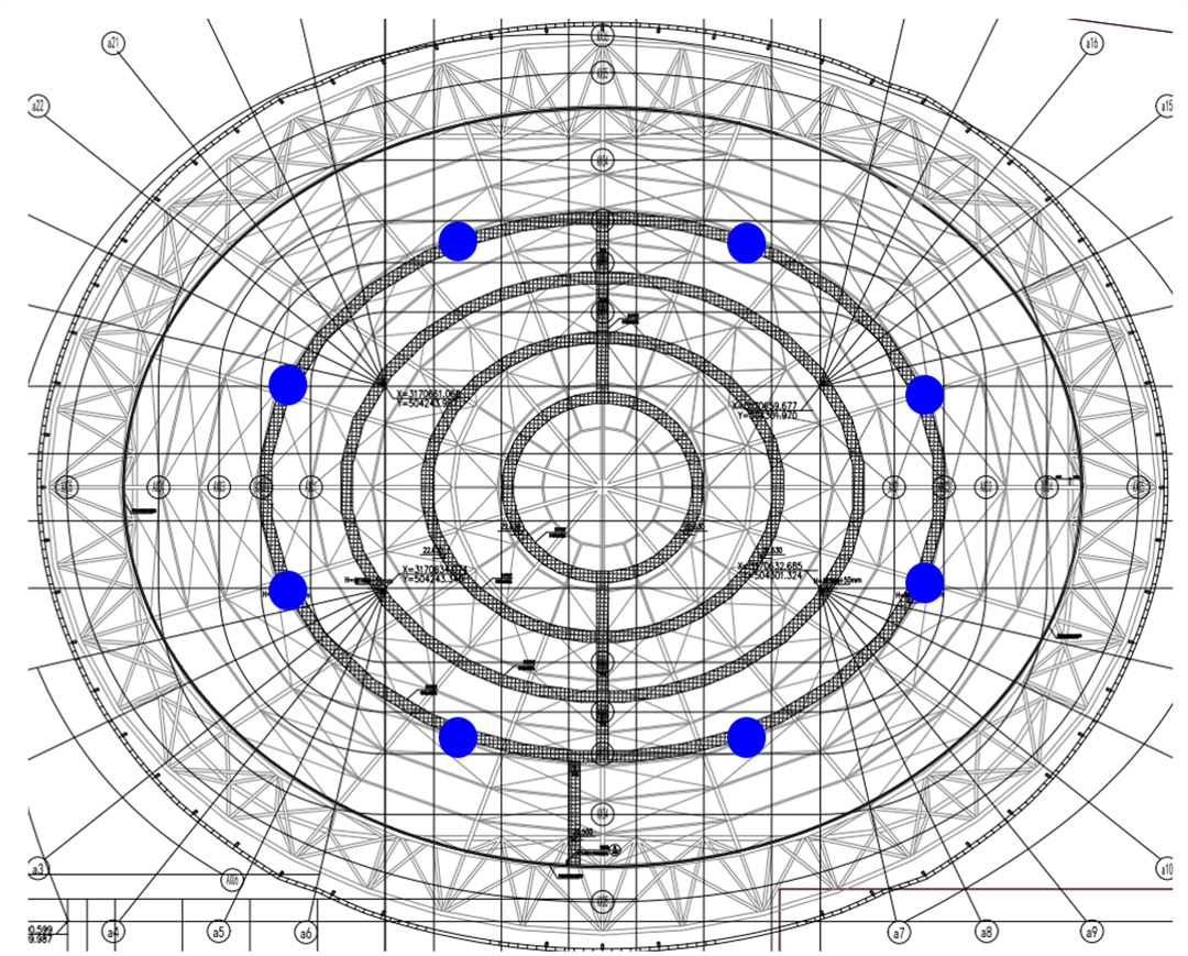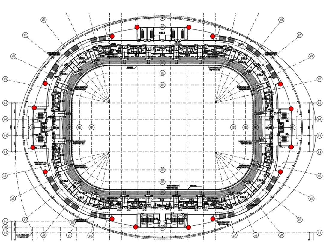 本项目采用“下部混凝土框架+上部钢结构屋盖”体系:下部看台为钢筋混凝土框架,顶层单榀框架设屈曲约束支撑加强,提升抗侧刚度与承载性;上部为128米最大跨度的椭圆形轮辐式钢结构屋盖,由外圈三角桁架、内圈环形桁架及20榀径向桁架构成空间自平衡体系,铰接支承于看台梁顶。项目属规则性超限高层建筑及屋盖超限空间结构,经专项论证采取针对性抗震加强措施;对超长混凝土结构设后浇带、掺抗裂纤维控裂,大跨屋盖关键节点精细化设计,保障整体稳定可靠。
