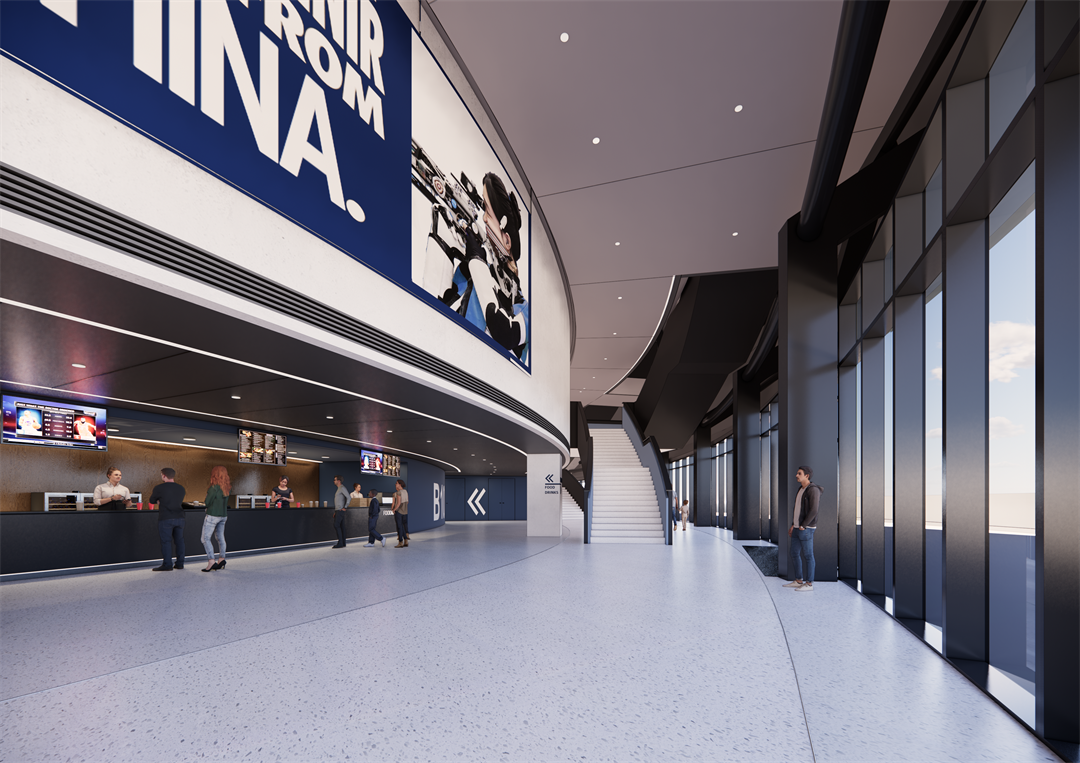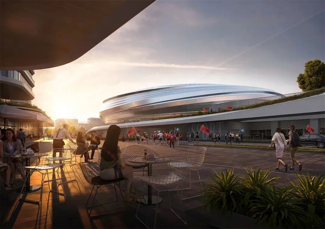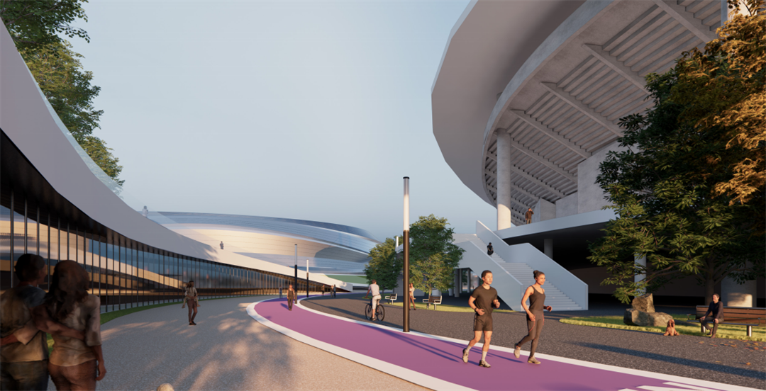 主体建筑形象层面,感性支配下的理性表达。设计采用绿色二层平台+标志性建筑叠合的竖向构成,连绵的平台把体育馆建筑与南侧规划训练场在二层连接为一个连续的空间,并依靠板上特有的绿色户外元素定义了体育中心西侧区域的空间特色;建筑立面整体以横向线条勾勒出水面般起伏的线条,使得整个建筑形式更具动势和力度。立面采用铝板及光伏组件,幕墙的转折交错,为立面增添了丰富的光影变化,充分体现体育建筑特有的力量之美,展现了简洁同时不失层次的立面特色。