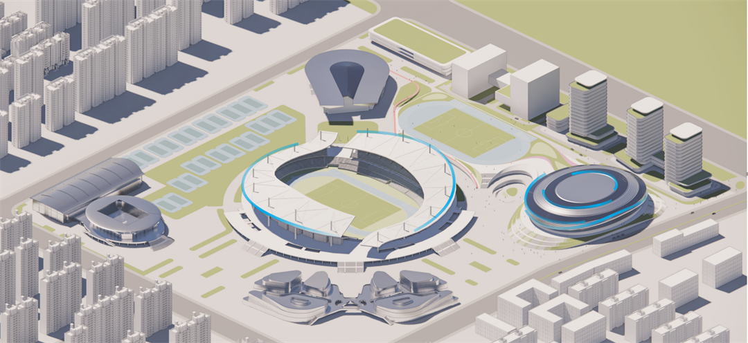 总体园区层面,新建的体育馆与现有体育中心形成负阴抱阳的总体格局,场馆群落形成有机的环抱态势。依据原有基地条件,以自由式为主进行规划布局,注重道路面积节约及地块使用效益,最大程度上提高土地使用率,做到“道路投入最小化和地块利用的最大化”。