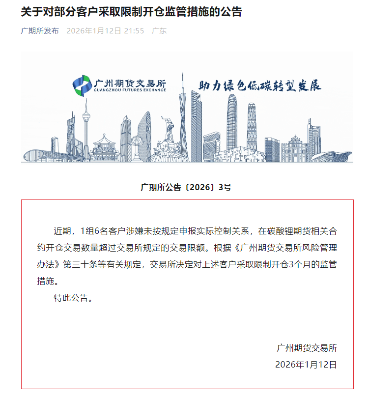 值得一提的是,1月12日,广期所发布发布自律监管通知,对1组6名涉嫌未按规定申报实际控制关系,在碳酸锂期货相关合约上开仓数量超过交易限额的客户,依据《广州期货交易所风险管理办法》等规定,采取限制开仓3个月的监管措施。