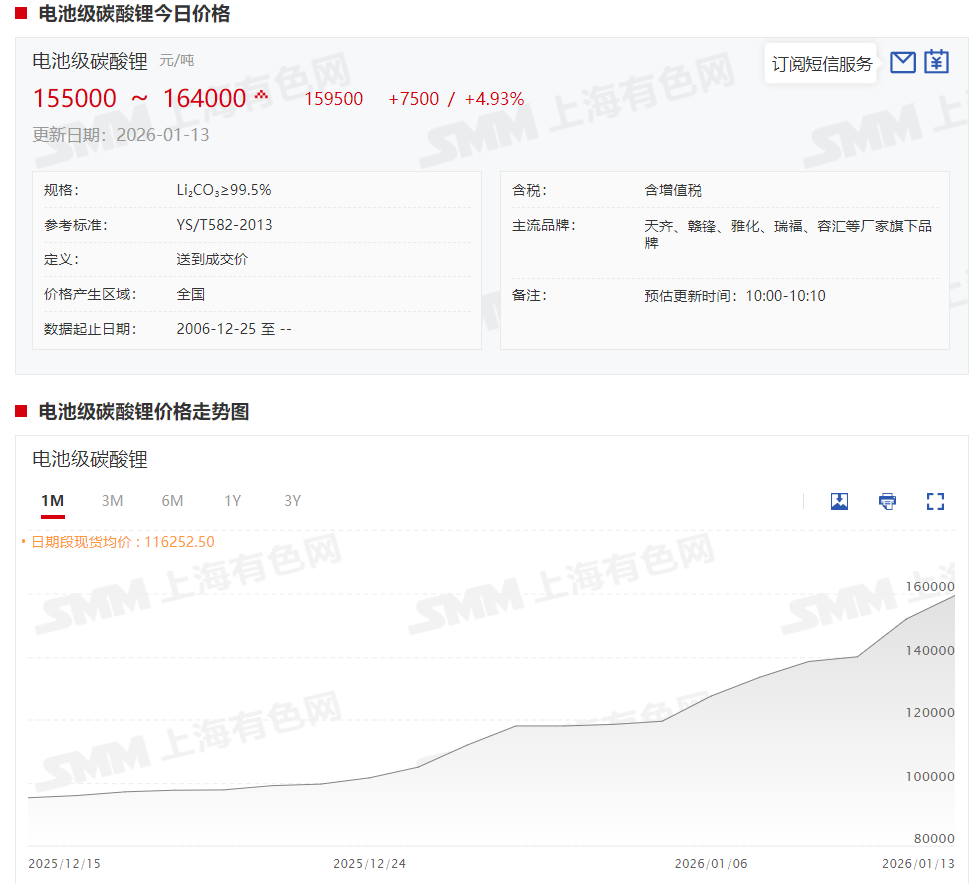 而碳酸锂作为锂电池的主要原材料之一,其现货报价近期也在快速上探,截至2026年1月13日,电池级碳酸锂现货报价已经涨至15.5~16.4万元/吨,均价报15.95万元/吨,较2025年年底的11.85万元/吨上涨 4.1万元/吨,涨幅达34.6%。