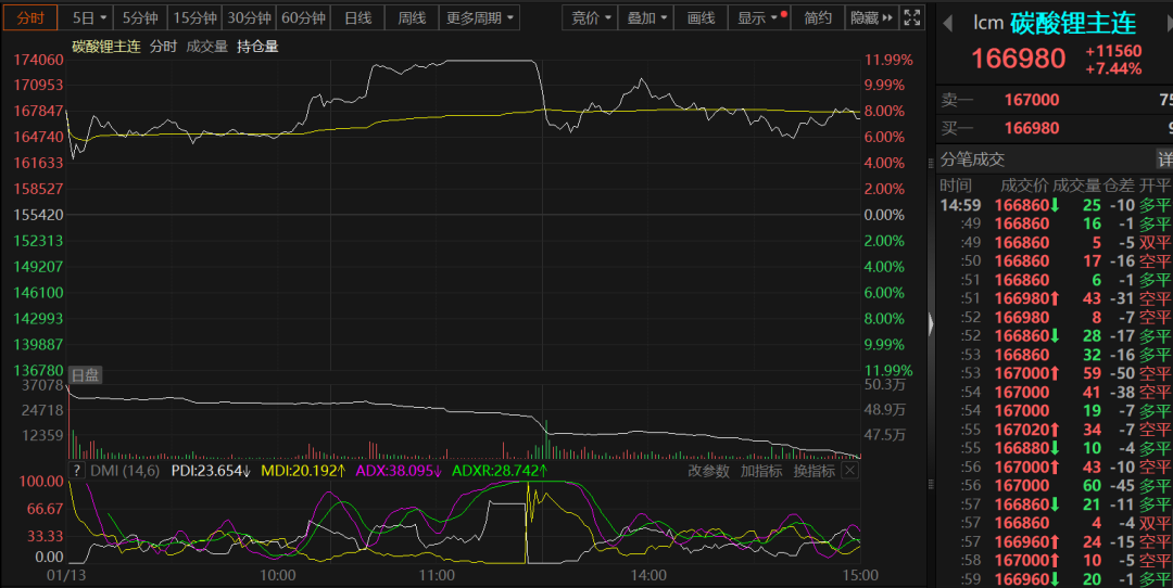 2026年开年,国内有色金属市场形势整体呈现一片大好的态势,贵金属价格更是一路飙升屡刷新高,在此背景下,碳酸锂期货涨势也十分可观,1月12日、1月13日更是接连跳空高开,在1月12日涨停封板之后,1月13日临近午间收盘,碳酸锂期货一度涨11.99%再度封死涨停板,盘中最高冲至174060元/吨的高位,刷新2023年10月以来的新高;但午间收盘前几分钟涨停板打开,截至日间收盘,碳酸锂主连以7.44%的涨幅报166980元/吨。