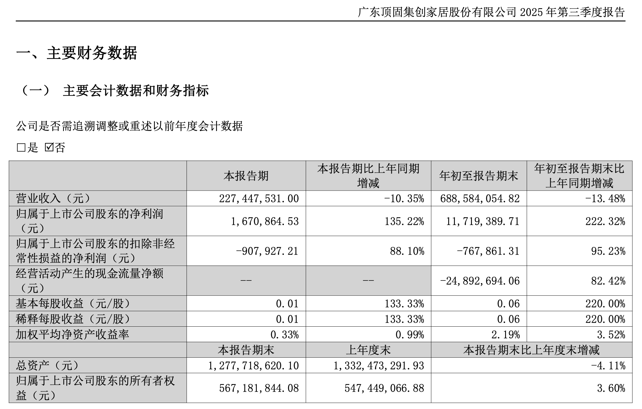 从业绩表现来看,数据显示,2024年,顶固集创(300749.SZ)实现营业收入10.27亿元,同比下降20.06%;归属于上市公司股东的净利润为亏损1.75亿元,同比下降982.54%;2025前三季度,顶固集创营业收入约为6.89亿元,同比减少13.48%。归母净利润为1171.94万元,同比增长222.32%。