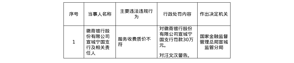 罚单显示,徽商银行股份有限公司宣城宁国支行的主要违法违规事实(案由)为:服务收费质价不符。