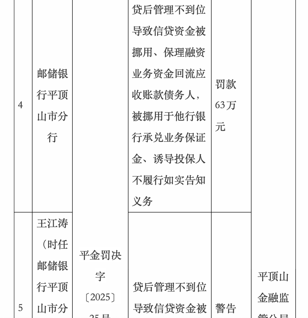 邮储银行平顶山市分行在此次处罚中问题较为突出。其存在贷后管理不到位导致信贷资金被挪用、保理融资业务资金回流应收账款债务人且被挪用于他行银行承兑业务保证金,以及诱导投保人不履行如实告知义务等违规情形。依据相关规定,监管部门对邮储银行平顶山市分行开出63万元的罚单。