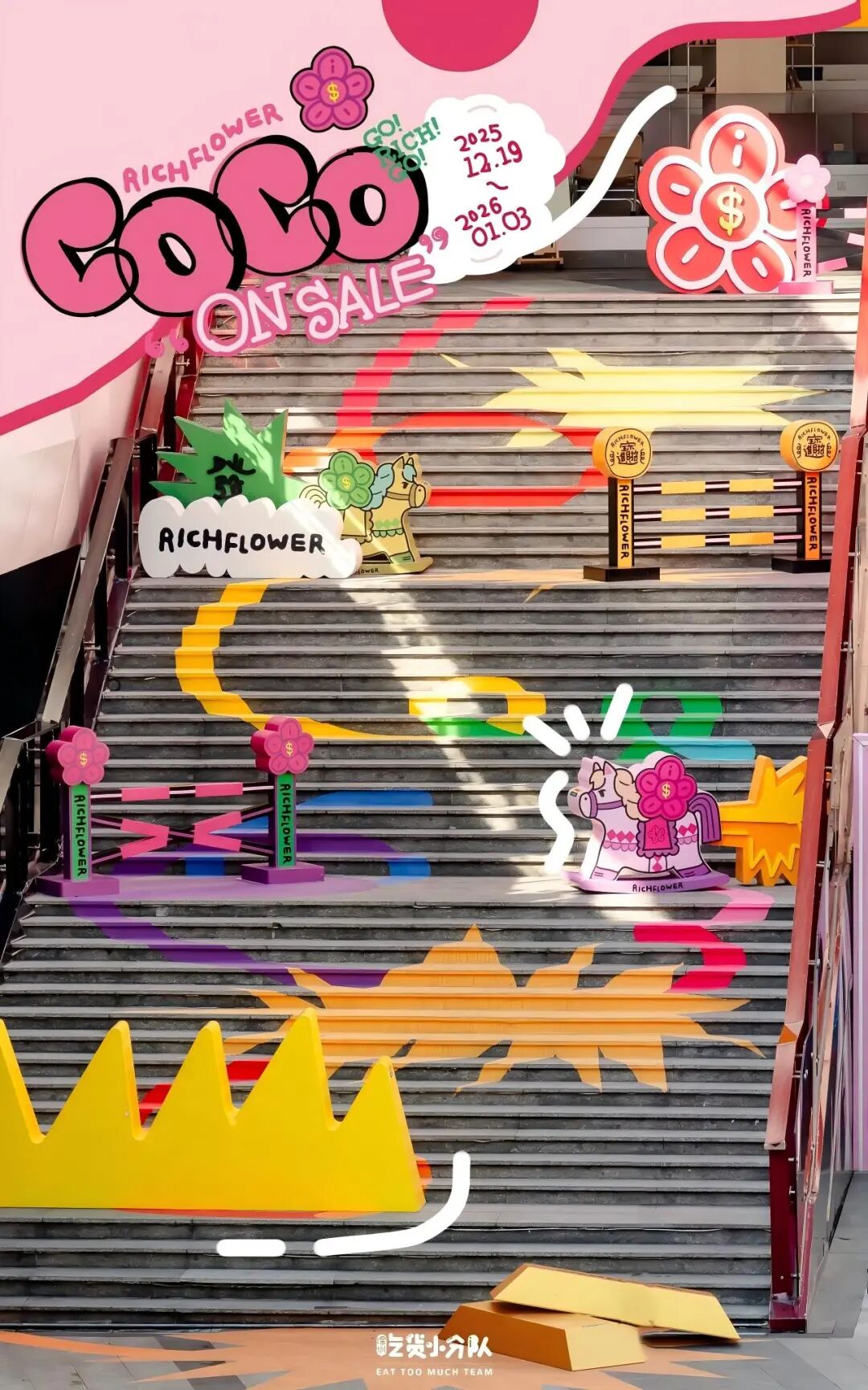 深圳福田星河COCO Park化身为艺术跑马地,12米高的巨型「马上有钱花」艺术装置、满满祝福的「花路」以及艺术家李昱昱现场涂鸦创作,打造出兼具视觉冲击力与互动传播性的“淘金热”场域。同时项目结合chiiikawa、犬夜叉等7档深圳独家快闪活动,最终实现全渠道曝光超5500万,成功破圈。